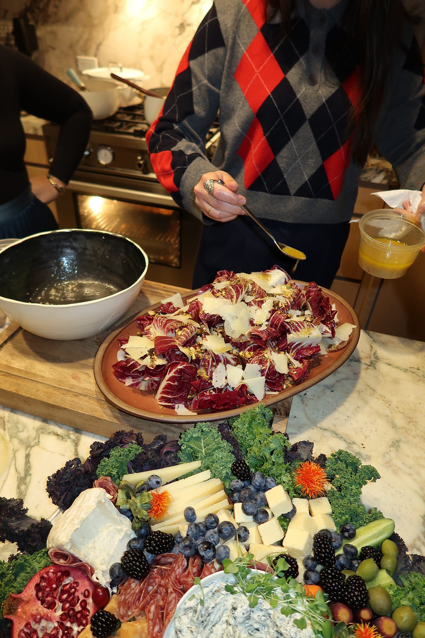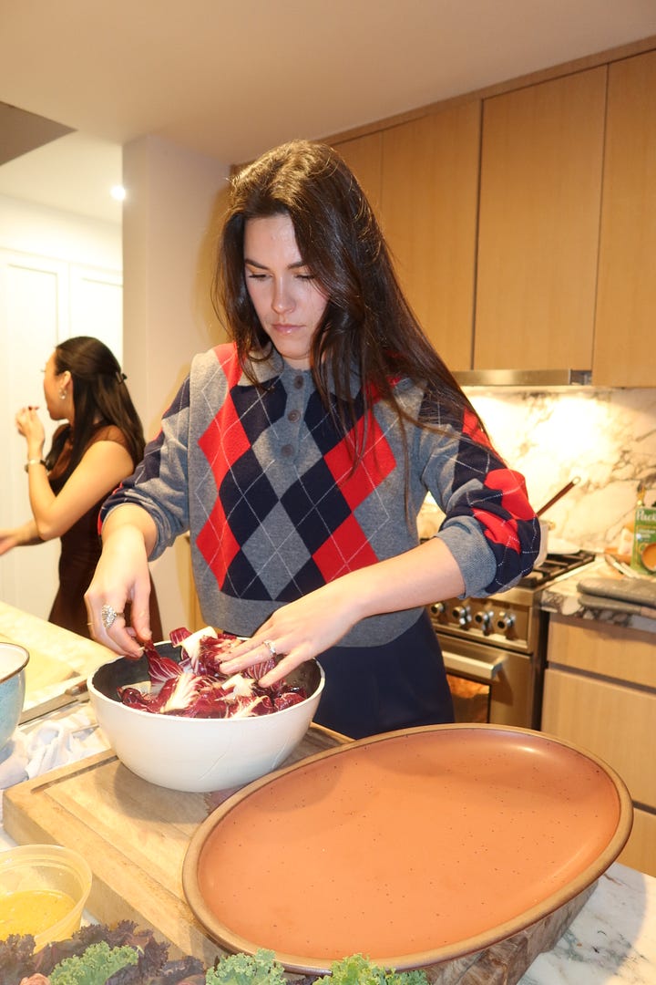 I brought a trevisano salad (an elongated version of raddichio) with aged shaven pecorino, chopped roasted and salted pistachios, and slivered dates. I used the dressing from my latest substack post: Miso Vinaigrette. I am honored to say it was a big hit at the event. I am a bit of a salad queen if I do say so myself. The trick is to dress the leaves separately from the rest of the ingredients on this salad and then layer the toppings on after. This allows you to have an evenly distributed amount of toppings in every bite. Very important.